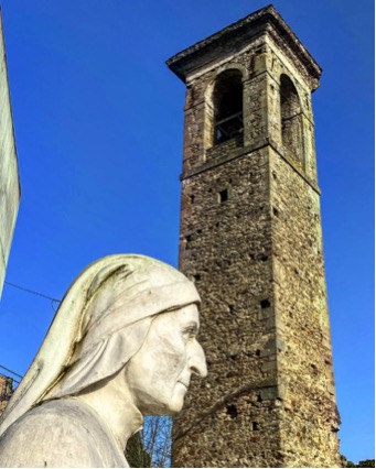 Facciamo un itinerario dei luoghi danteschi in Lunigiana, iniziando appunto da Castelnuovo, percorriamo via Dante, una strada in salita che dalla chiesa conduce al palazzo vescovile, fatto costruire dal Vescovo Enrico da Mugello nel 1273, di cui rimangono due torri, una quadrata e l’altra tonda collegate da un muraglione, sul quale è possibile osservare un medaglione con l’effige del poeta ed una sottostante scritta che ricorda il suo passaggio qui.