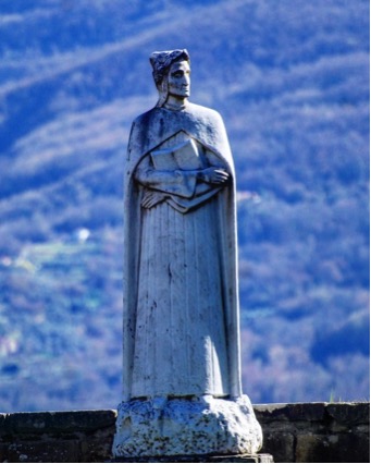 Nel castello di Villafranca distrutto a causa dei bombardamenti della Seconda Guerra Mondiale, troviamo l’unico ricordo dantesco: un monumento in marmo bianco a pieno corpo del poeta, posto all’interno del telaio di una porta, in simbolico riferimento alla discesa infernale della prima cantica.